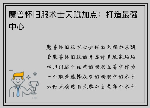 1. 什么是装备重铸 装备重铸是魔兽世界中一项重要的系统,它允许玩家重新分配装备的属性。通过重铸,玩家可以根据自己的需求和角色的特点,调整装备的属性,提升角色的战斗能力。 2. 重铸属性的选择原则 在进行装备重铸时,玩家需要根据自己的职业、角色定位和当前装备的属性,进行合理的属性选择。以下是几个重铸属性选择的原则: 2.1 职业特点 不同职业在战斗中有不同的特点和需求,因此在进行装备重铸时,需要根...